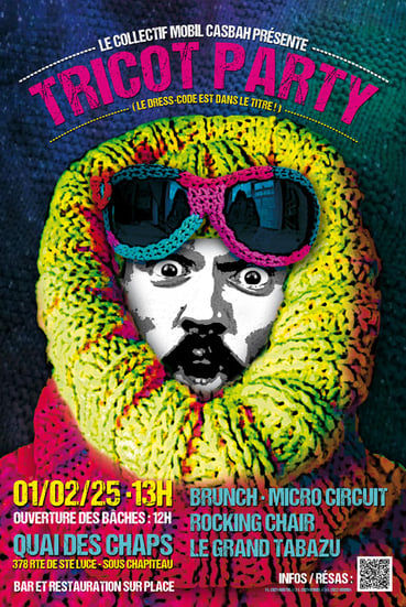 Comme tous les ans, le collectif Mobil Casbah organise une party d'hiver. Cette année, on vous invite en habit de TRICOT pour mettre en lumière les mailles serrées, mixées, colorées, ajourées, en laine, en jersey, en point mousse ou gordon et les reprisées !
