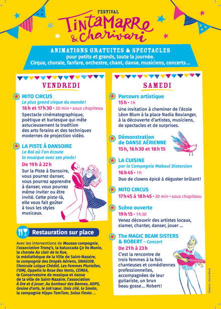 Depuis 4 ans, les quartiers ouest de Saint-Nazaire s'animent grâce au festival "Tintamarre et Charivari". Cet évènement, porté par les maisons de quartiers Chesnaie et Bouletterie, soutenue par Le Collectif Mobil Casbah, est un rendez-vous incontournable de l'été ! Le premier weekend de juillet, sur la place Nadia Boulanger s'enchainent des animations, des spectacles et des concerts.