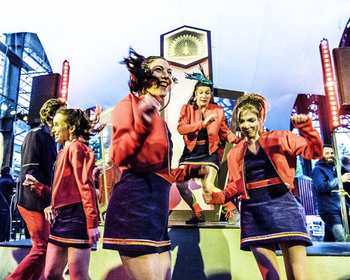Dans cette seconde création, la Piste à Dansoire vous invite dans son palace clinquant, à mi-chemin entre bal disco et boîte de nuit itinérante. Enchaînant disco, funk, afrobeat, rock, yéyé, hip-hop, chachacha congolais et tarentelle électro, meneurs de danse et musiciens nous emmènent, l’air de rien, vers une fantaisie endiablée.