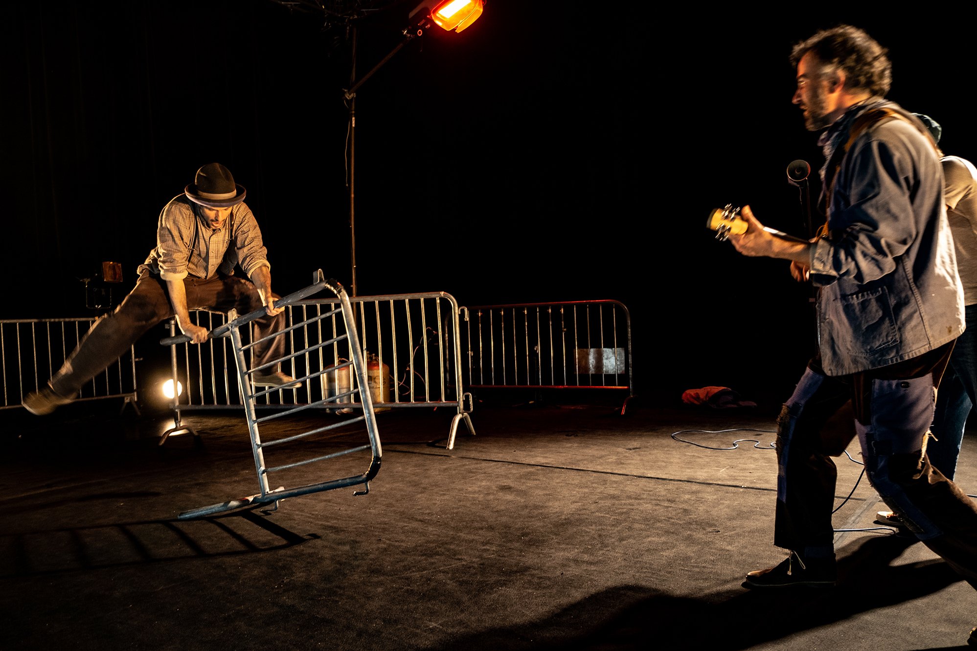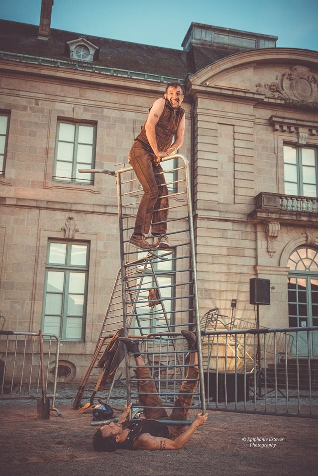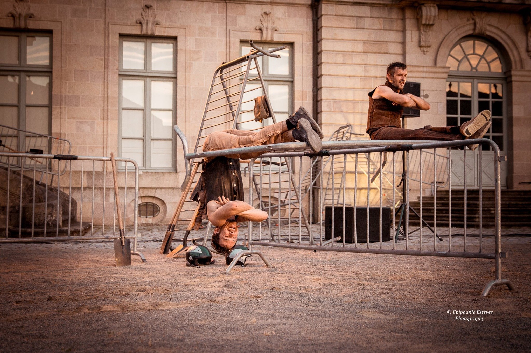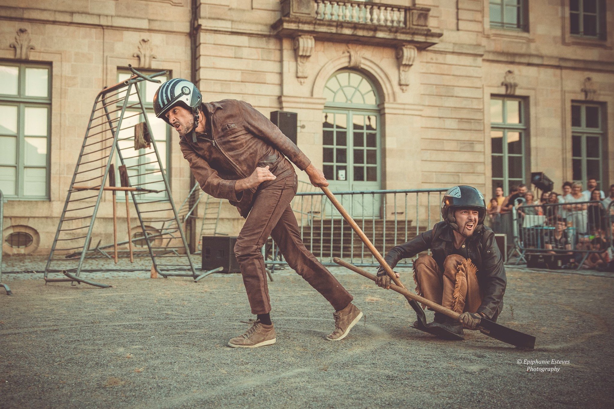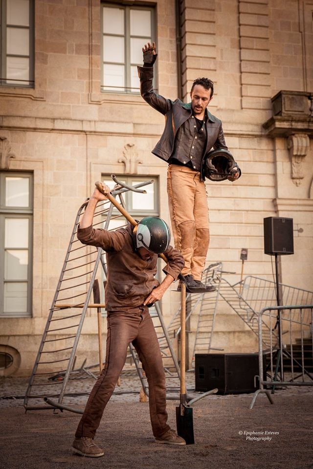 Dans une ambiance blues détonante, ils se mettent à l'épreuve dans des jeux d'équilibres. Ils jouent d’un rien, tout en détournant pelles bêches et barrières Vauban, le temps d'une performance absurde et périlleuse.