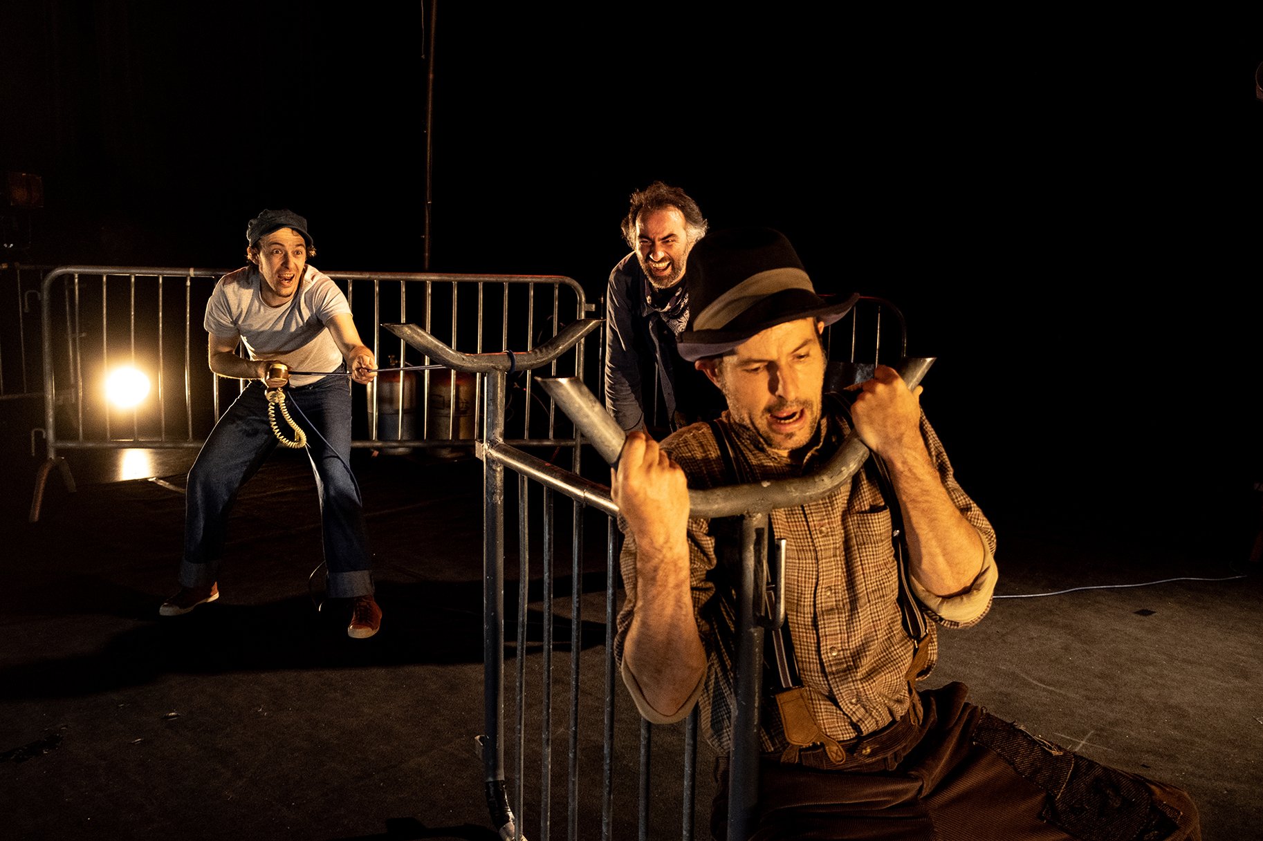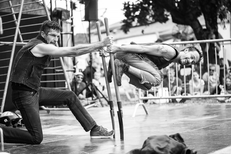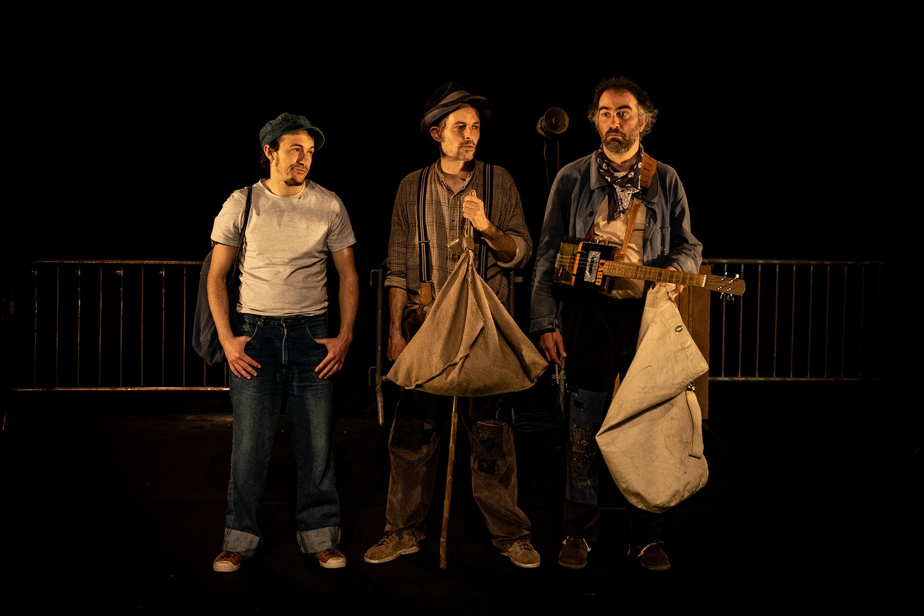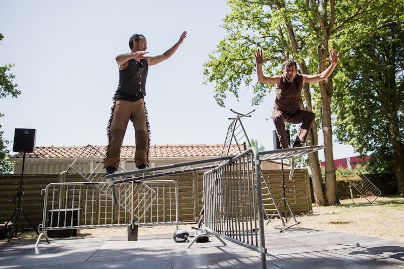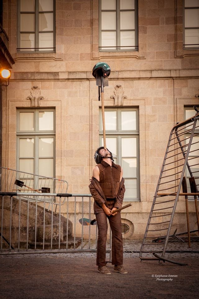 Dans une ambiance blues détonante, ils se mettent à l'épreuve dans des jeux d'équilibres. Ils jouent d’un rien, tout en détournant pelles bêches et barrières Vauban, le temps d'une performance absurde et périlleuse.